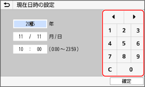 管理者名など、漢字やひらがなを入力する必要がある場合は、リモートUIで操作します。パソコンによる本機の管理 - リモートUI キーボードやテンキーではなく、[+]/[-]やスライダーが表示された場合は、これらをタップ/ドラッグして値を設定します。[+]/[-]やスライダーで値を設定する |