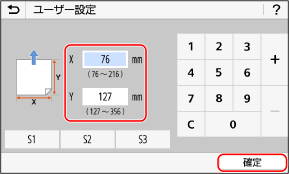 2 | [X]辺と[Y]辺の長さを入力し、[確定]を押す よく使用する定形外サイズの用紙を登録している場合は、[S1]~[S3]を押して呼び出すことができます。 |