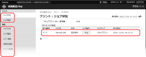 管理者モードまたは部門IDでログインしている場合は、すべてのプリント状況が表示されます。