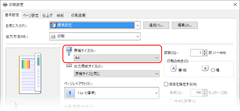 [基本設定]タブの[原稿サイズ]で、文書の用紙サイズを選択する