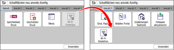 Sie können die Schaltflächen auf dem Bildschirm [Startseite] neu anordnen und Schaltflächen auf andere Registerkarten verschieben.