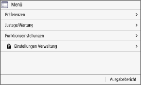 Ändern der BildschirmanzeigeSie können die Anzeige des Bedienfelds anpassen, indem Sie beispielsweise die Anzeigesprache und die Einheiten ändern sowie die Meldungen ein- oder ausblenden. [Einstellungen Anzeige]Zur besseren Lesbarkeit des Bildschirms können Sie die Farben invertieren und die Helligkeit anpassen. [Barrierefreiheit]Automatisches Zurücksetzen der EinstellungenStandardmäßig werden die auf dem Bildschirm konfigurierten Einstellungen zurückgesetzt und der Bildschirm [Startseite] wird angezeigt, wenn nach einer bestimmten Zeitspanne keine Bedienschritte ausgeführt werden. Sie können die Zeit bis zur Rücksetzung der Einstellungen und den danach angezeigten Bildschirm ändern. [Zeit bis zur autom. Rückst.][Funktion nach autom. Rückst.] |