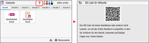 Auf einigen Bildschirmen, auf denen Fehlercodes oder Fehler angezeigt werden, wird ein QR-Code angezeigt, über den Sie auf die entsprechenden Seiten im Anwenderhandbuch zugreifen können.