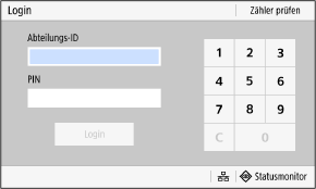 Wenn die Verwaltung per Abteilungs-ID eingerichtet ist, wird der folgende Anmeldebildschirm angezeigt. Geben Sie die Abteilungs-ID ein, um sich anzumelden. Wenn eine PIN eingerichtet ist, geben Sie die PIN ein.