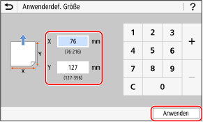 2 | Geben Sie die Werte unter [X] und [Y] ein, und drücken Sie [Anwenden]. Wenn häufig verwendete nicht standardmäßige Formate registriert sind, können Sie diese durch Drücken von [S1] bis [S3] abrufen. |