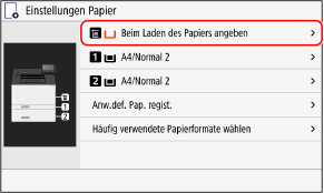 Wenn Sie immer das gleiche Papier in das Mehrzweckfach einlegen, können Sie das Papierformat und den Papiertyp registrieren. Dadurch wird verhindert, dass der Bildschirm für die Papiereinstellungen angezeigt wird, so dass Sie sich die Konfiguration der Einstellungen sparen können.