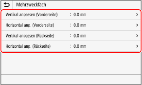 Sie können die Justagerichtung und Justagebreite für jede Papierzufuhr und Druckseite (Vorder- und Rückseite) festlegen.