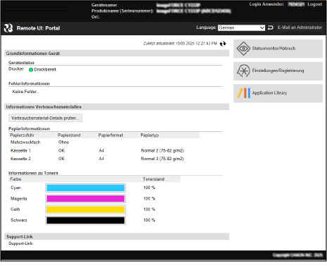 Wenn Sie sich bei Remote UI anmelden, wird die Portalseite (Hauptseite von Remote UI) angezeigt. Von hier aus können Sie den Betriebsstatus des Geräts überprüfen, verschiedene Informationen anzeigen und die Einstellungen per Schaltflächenbetätigung ändern.
