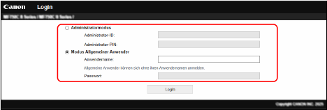 Wählen Sie [Administratormodus] oder [Modus Allgemeiner Anwender], und geben Sie die erforderlichen Elemente gemäß dem Einrichtungsstatus ein.