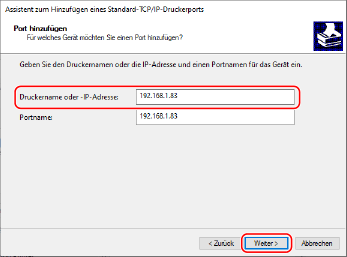 3 | Geben Sie die IP-Adresse oder den DNS-Namen (Hostname) ein, und klicken Sie dann auf [Weiter]. Der Anschlussname wird automatisch eingegeben, ändern Sie ihn also bei Bedarf. Wenn [Zusätzliche Anschlussinformationen erforderlich] erscheint Befolgen Sie die Anweisungen auf dem Bildschirm. Um [Gerätetyp] festzulegen, wählen Sie [Canon Network Printing Device with P9100] unter [Standard]. |