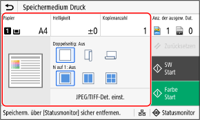 Auf dem Bedienfeld im Bildschirm [Startseite] drücken Sie auf [Speichermed. Druck].