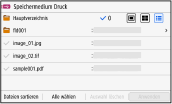 Stecken Sie das USB-Speichergerät in das Gerät ein und auf dem Bildschirm [Startseite] drücken Sie [Speichermed. Druck], um die Dateien und Ordner auf dem USB-Speichergerät anzuzeigen.