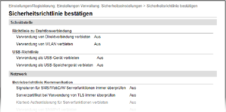 Sie können die Elemente der Sicherheitsrichtlinie und ihre Nutzung über die Remote UI auf dem Bildschirm [Sicherheitsrichtlinie bestätigen] überprüfen.