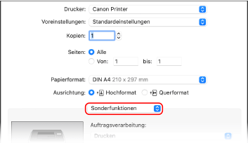 2 | Wählen Sie im Popup-Menü der Druckoptionen die Option [Sonderfunktionen]. Wenn die Druckoptionen nicht angezeigt werden, klicken Sie im Druckdialogfeld auf [Details einblenden]. |