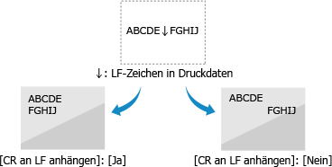 [PCL]Geben Sie an, ob ein Wagenrücklauf (CR) angehängt werden soll, wenn das Gerät einen Zeilenvorschubcode (LF) empfängt. Wenn [Ja] ausgewählt ist, springt die Druckposition an den Anfang der nächsten Zeile, wenn das Gerät einen LF-Code empfängt. Wenn [Nein] ausgewählt ist, springt die Druckposition in die nächste Zeile, direkt unter den empfangenen LF-Code. |