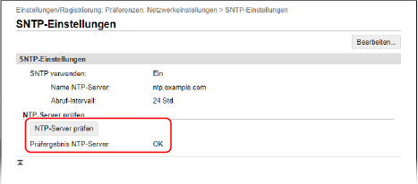 Testen der Kommunikation mit dem NTP- oder SNTP-ServerTesten Sie die Kommunikation anhand des folgenden Verfahrens: Wenn das Gerät korrekt mit dem Server kommuniziert, erscheint [OK] unter [Prüfergebnis NTP-Server]. Melden Sie sich bei Remote UI im Administratormodus an  klicken Sie auf [Einstellungen/Registrierung]  [Netzwerkeinstellungen]  [SNTP-Einstellungen]  [NTP-Server prüfen]. |