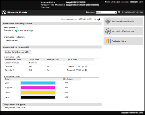 Quando si accede alla IU remota, viene visualizzata la pagina portale (prima pagina della IU remota). Da qui è possibile verificare lo stato operativo della macchina, visualizzare varie informazioni e modificare le impostazioni mediante l’utilizzo dei pulsanti.