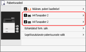 Vaikimisi on sahtlis paberi formaadi ja tüübi säteteks A4 ja Tavapaber 2. Kui panete sahtlisse erineva formaadiga või tüüpi paberit, muutke paberi sätteid.