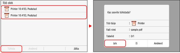Kui kuvatakse tööde loend, valige tühistatav töö ja vajutage [Tühista]