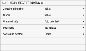 Kuva avamiseks vajutage [Määra JPEG/TIFF-i ük.] funktsiooni Memory Media Print sätete kuval.