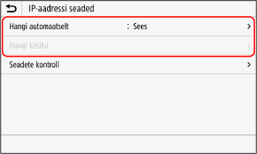 2 | Määrake sätte [Hangi automaatselt] olekuks [Väljas] ja vajutage [Rakenda] [OK].Ilmub kuva [IP-aadressi seaded]. |