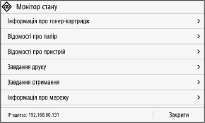 Цей екран відображається, якщо натиснути [Монітор стану] на екрані [Головний] і в інших розташуваннях. Цей екран дає змогу перевірити інформацію про апарат, його використання та журнали, параметри мережі й відомості про помилки.