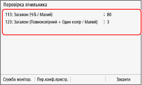 Операції, доступні на екрані перегляду лічильникаЕлементи, які відображаються на екрані, відрізняються залежно від країни або регіону. Натисніть [Служба монітор.], щоб перевірити з’єднання із сервером відстеження. Виконайте цю операцію, щоб регулярно надсилати інформацію про апарат на сервер відстеження. Натисніть [Пер.конф.пристр.], щоб перевірити конфігурацію параметрів на апараті.