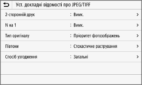 На цьому екрані можна налаштувати детальні параметри друку для файлів у форматах JPEG і TIFF, і таким чином відрегулювати якість зображення.