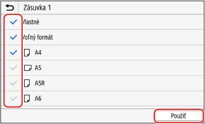 Zrušte začiarknutie políčok pre veľkosti papiera, ktoré chcete skryť, a potom kliknite na položku [Použiť].