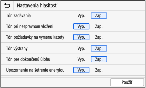 Nastavte si, či sa má upozorňovať zvukom na stlačenie tlačidiel a tlačidiel na ovládacom paneli.
