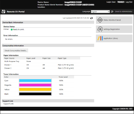 Keď sa prihlásite do vzdialeného používateľského rozhrania, zobrazí sa stránka portálu (horná stránka vzdialeného používateľského rozhrania). Odtiaľ môžete skontrolovať prevádzkový stav zariadenia, zobraziť rôzne informácie a zmeniť nastavenia pomocou tlačidlových operácií.