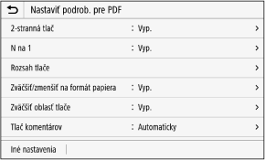 Ak chcete zobraziť túto obrazovku, na obrazovke s nastaveniami tlače z pamäťového média stlačte tlačidlo [Nast. podr. pre PDF].