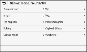Táto obrazovka sa používa na konfiguráciu podrobných nastavení tlače súborov formátu JPEG a TIFF (napríklad úprava nastavenia kvality obrazu).