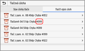 Ak nie je možné vykonať tlač, prijať I-fax alebo sa vyskytne iná chyba, vo výpise úloh sa zobrazí chybový kód (trojmiestne číslo začínajúce „#“).