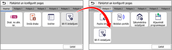 Pogas ekrānā [Sākums] var pārkārtot un pogas var pārvietot uz citām cilnēm.