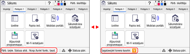 ]. Pēc noklusējuma ekrāns [Sākums] tiek parādīts pēc iekārtas ieslēgšanas un uzreiz pēc sākšanas ekrāna aizvēršanas, un uzreiz pēc pieteikšanās. Ekrāns [Sākums]