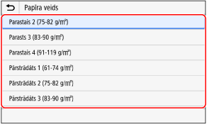 Ja jums ir bieži jāmaina ievietojamais papīrs, izmantojiet opciju [Brīvs] — tādējādi katrā iekārtas lietošanas reizē varēsit mainīt iestatījumu, veicot mazāku skaitu darbību. Tomēr ņemiet vērā, ka šis iestatījums ļauj iekārtai veikt drukāšanu, pat ja printera draivera papīra veida iestatījums neatbilst iekārtā ievietotajam papīra veidam.