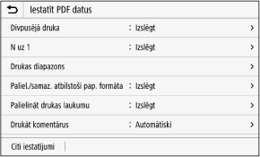 * Šis ir tas pats iestatījums kā [N uz 1] atmiņas datu nesēja drukas iestatījumu ekrānā. Tomēr opcija [9 uz 1] un [16 uz 1] funkcijai [N uz 1] ir pieejama tikai ekrānā [Iestatīt PDF datus].