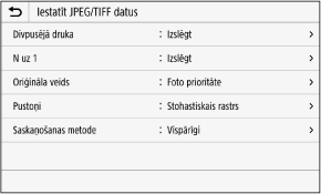 Lai konfigurētu drukas iestatījumus JPEG un TIFF failiem, piemēram, lai pielāgotu attēlu kvalitāti, izmantojiet šo ekrānu.