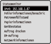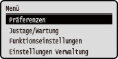 Ändern der BildschirmanzeigeSie können die Anzeige des Bedienfelds anpassen, indem Sie beispielsweise die Anzeigesprache und die Einheiten ändern sowie die Meldungen ein- oder ausblenden. [Einstellungen Anzeige] Zur besseren Lesbarkeit des Bildschirms können Sie die Farben invertieren und die Helligkeit anpassen. [Barrierefreiheit] Automatisches Zurücksetzen der EinstellungenStandardmäßig werden die auf dem Bildschirm konfigurierten Einstellungen zurückgesetzt und der Bildschirm [Startseite] wird angezeigt, wenn nach einer bestimmten Zeitspanne keine Bedienschritte ausgeführt werden. Sie können die Zeit bis zur Rücksetzung der Einstellungen und den danach angezeigten Bildschirm ändern. [Zeit bis zur autom. Rückst.] [Funktion nach autom. Rückst.] |