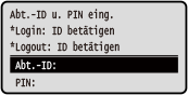 Wenn die Verwaltung per Abteilungs-ID eingerichtet ist, wird der folgende Anmeldebildschirm angezeigt. Geben Sie die Abteilungs-ID ein, um sich anzumelden. Wenn eine PIN eingerichtet ist, geben Sie die PIN ein.