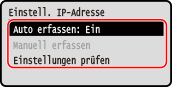 4 | Wählen Sie [<Anwenden>], und drücken Sie dann .Der Bildschirm [Einstell. IP-Adresse] wird angezeigt. |