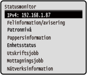 Ändra skärminställningarDu kan ändra inställningarna för hur kontrollpanelen visas. Du kan t.ex. ändra språk och måttenheter samt visa eller dölja meddelanden. [Skärminställningar] Du kan invertera färgerna och ändra ljusstyrkan för att det ska vara lättare att läsa på skärmen. [Hjälpmedel] Ta bort inställningar automatisktOm ingen åtgärd har utförts under en viss tidsperiod är standardinställningen att angivna inställningar på skärmen tas bort och skärmen [Hem] visas. Du kan ändra tiden tills inställningarna tas bort och nästa skärm visas. [Autoåterställning av tid] [Funktion eft. autoåterställn.] |