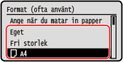 När papper fylls på i universalfacket visas skärmen för inställning av pappersformat och papperstyp på kontrollpanelen.