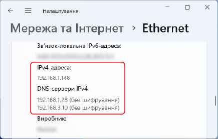 2 | У розділі [Властивості] перегляньте відомості про IP-адресу та DNS-сервер. |
