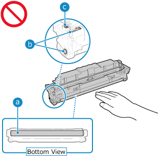 Be sure to hold the toner cartridge using the handle. Do not scratch the drum surface (  ) or expose it to light. Also, do not touch the electrical contacts (  ) or the toner cartridge memory (  ). |