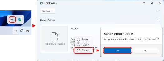 If the printer icon is not displayed in the Windows notification area or the document to be canceled is not displayed, the print data is sent to the machine after being processed on the computer.