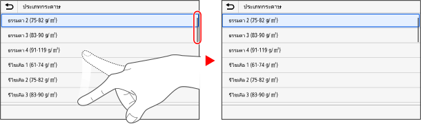 เมื่อแถบเลื่อนปรากฏขึ้นบนหน้าจอ แสดงว่ามีรายการหรือข้อมูลที่ไม่สามารถแสดงได้ครบถ้วนในหน้าจอนั้น ให้ตวัดนิ้วหรือลากเพื่อเลื่อนหน้าจอไปในทิศทางที่คุณเลื่อนปลายนิ้ว