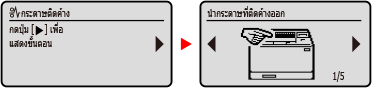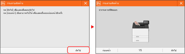 เมื่อข้อความปรากฏขึ้นบนหน้าจอ หากข้อความยาวเกินกว่าที่จะแสดงได้ในคราวเดียว ข้อความอาจถูกแบ่งเป็นส่วนที่สั้นลงและแสดงขึ้นสลับกัน รุ่นแผงสัมผัส ![]() รุ่น LCD ขาวดำ ![]() |