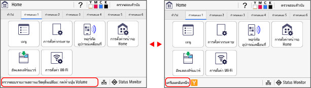 ] บนแผงควบคุม ตามค่าเริ่มต้น หน้าจอ [Home] จะปรากฏขึ้นมาหลังจากเปิดเครื่อง ทันทีที่ปิดหน้าจอเริ่มต้น และทันทีที่เข้าสู่ระบบ หน้าจอ [Home]รุ่นแผงสัมผัส | รุ่น LCD ขาวดำ | |